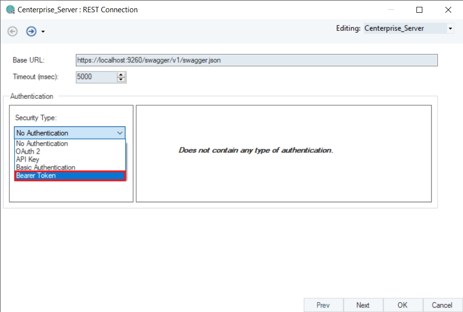 This will open the API Connection screen. Select the Security Type as Bearer Token, as Astera Server APIs use Bearer Token authentication.