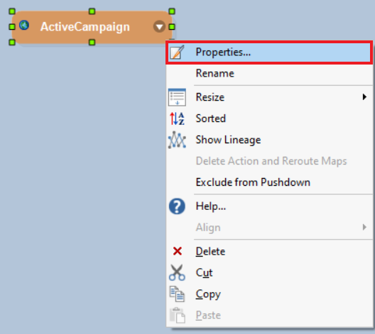 The ActiveCampaign .sact file will open in the designer. Now, right-click the shared action file’s header and select Properties.