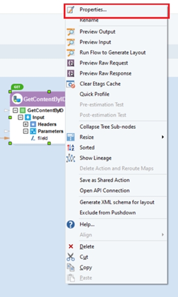 To explore the API Client object for this method, right-click on the object’s header and select Properties.
