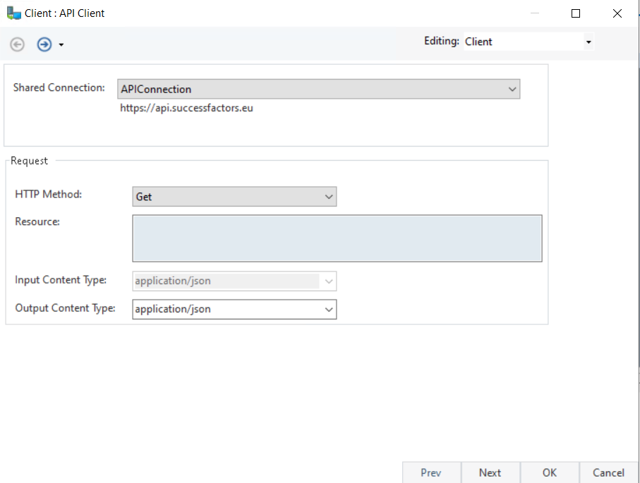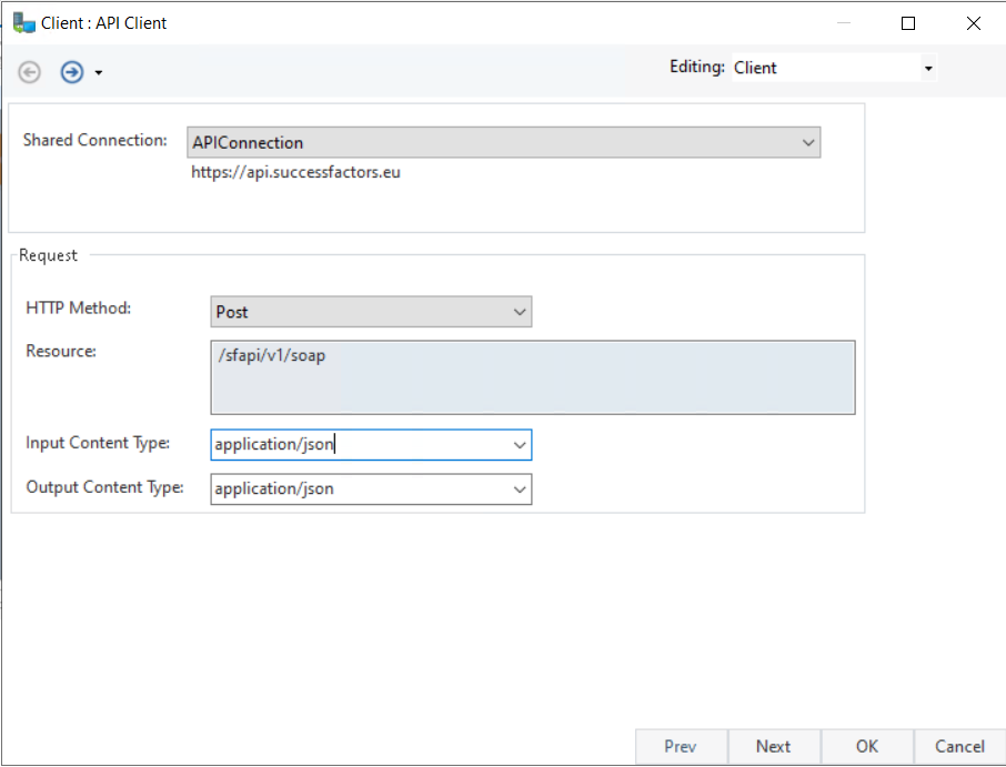 3. Next, open the properties of the *API Client* object and select the configured shared connection from the drop-down.