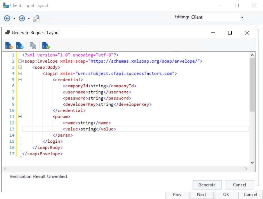 On the *Input Layout* screen click on *Generate Layout by Providing Sample Text* and supply the raw xml content to be sent in the request.