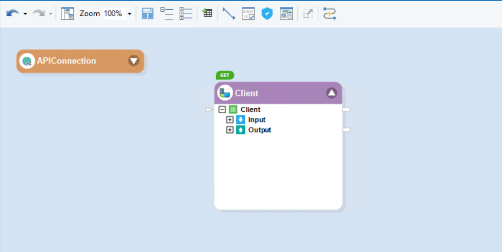 1. To start, drag-and-drop the *API Connection* and *API Client* objects onto the Dataflow.