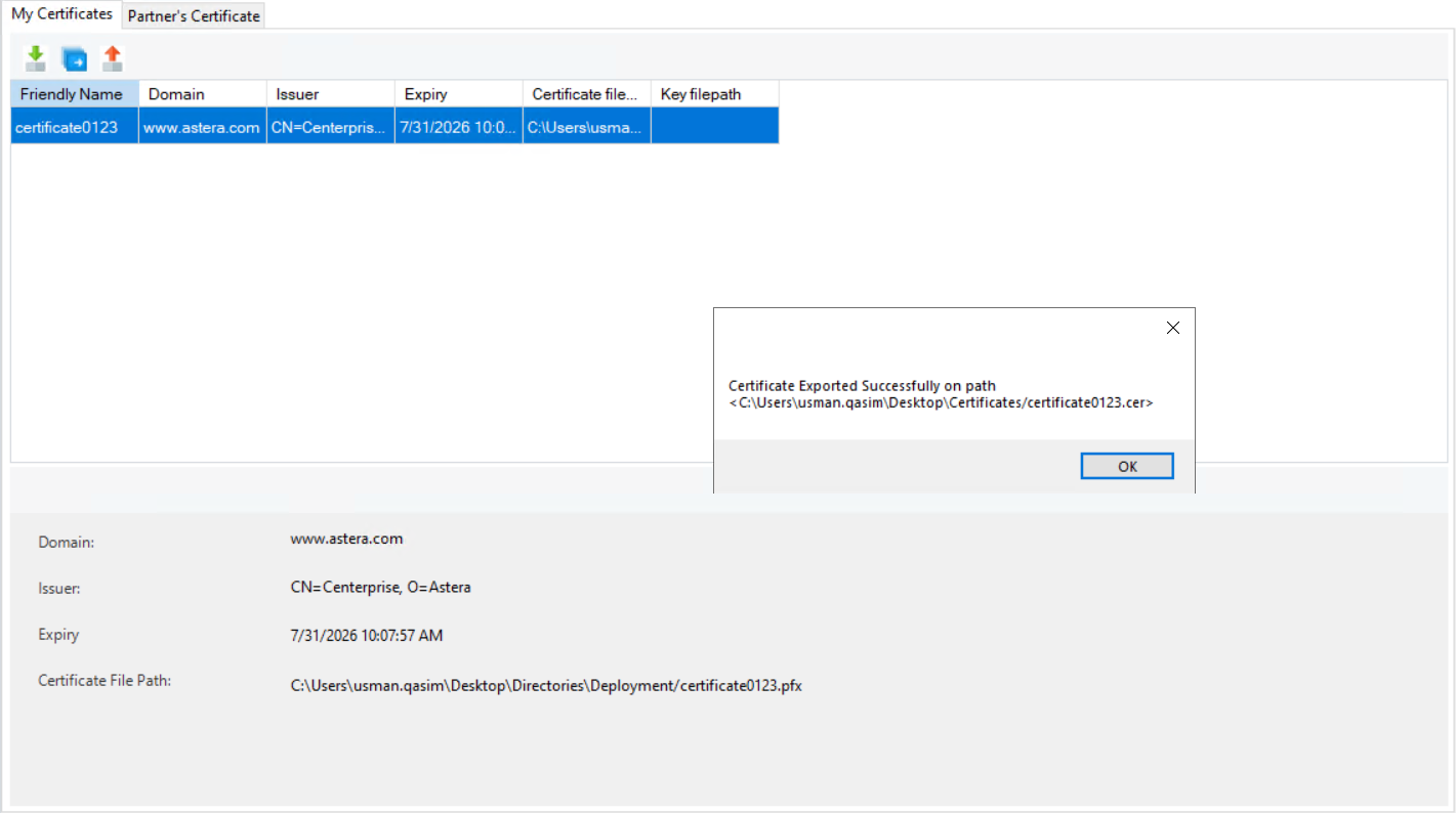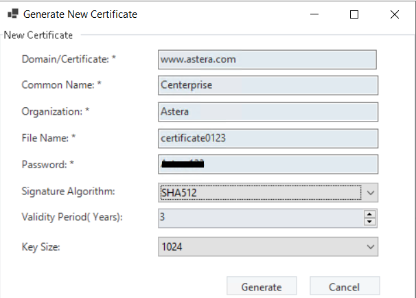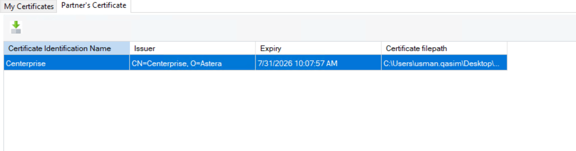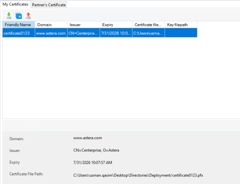 Astera provides users with a certificate store, enabling them to perform essential tasks such as importing, exporting, and generating certificates for various purposes, enhancing security and authentication in the API request using mutual TLS, and providing encrypted communication and data transfers.
