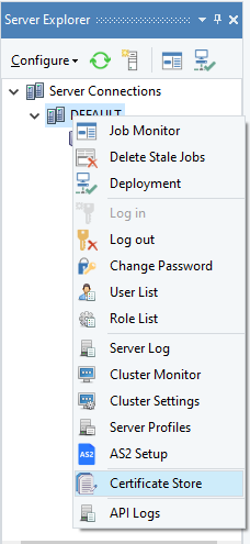 1. Right-click on the *Default cluster* node in the Server Explorer and select *Certificate Store* from the context menu.