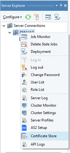 Right-click on the Default cluster node in the Server Explorer and select Certificate Store from the context menu.