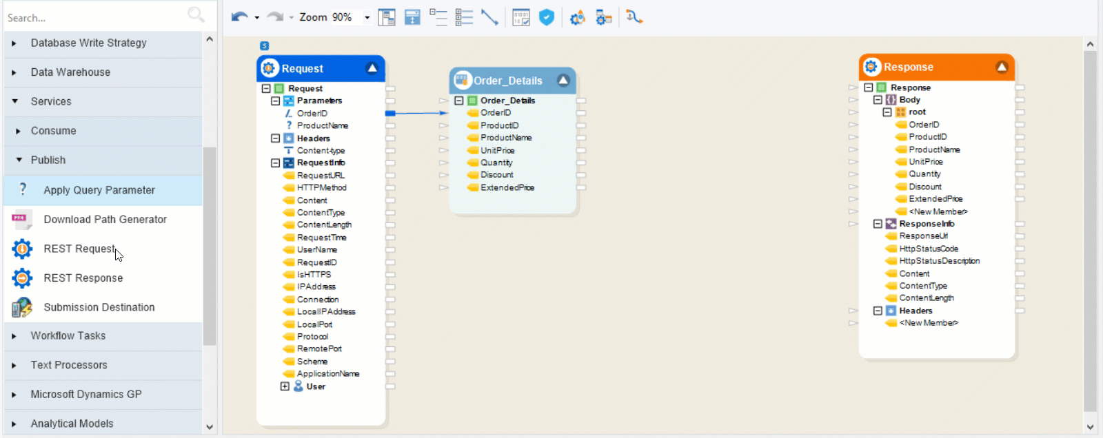 For our use case, we have a flow that fetches order items from the database for the given OrderID in the request. Now, to allow sorting and filter operations on this response data, we will add the Apply Query Parameter object right after the Database Lookup object and before the Response object.