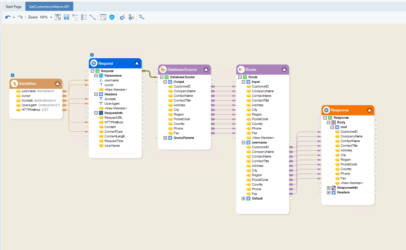 This API flow uses the GET HTTPS Method and allows the API user to view the Customers table’s records based on the value of the URI parameter username. For demonstration, Header parameters i.e., Accept, UserAgent, Query parameter i.e., cursor, and RequestInfo parameters i.e., HTTPMethod, Content-Type are also defined.