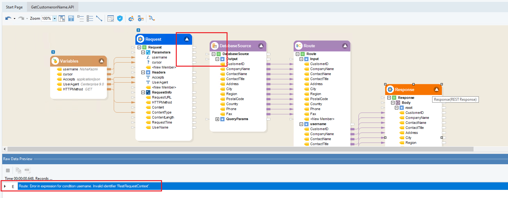 For example, we can see that the flow of data has been broken between the Request and Database Source object, resulting in an error state i.e., the Route is unable to identify a parameter, and as we preview the object we can see the error message in the window.