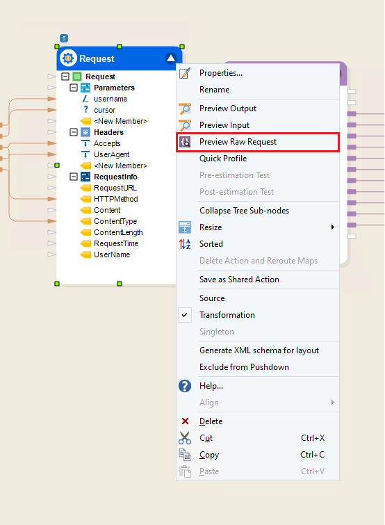 To define test values for the API flow, the Request object must be set as a transformation and any test data can be mapped to it. Right-click on the Request object and select Transformation.
