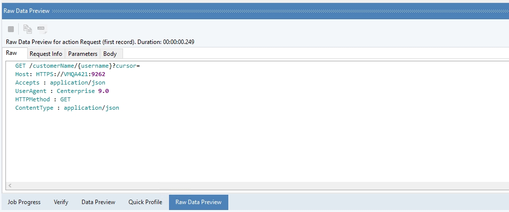 Since the request object is a Singleton object, only the first record is processed through the flow. This behavior compliments the runtime behavior of a single API call and provides ease in previewing the respective results. Let’s preview the Request object to observe this.