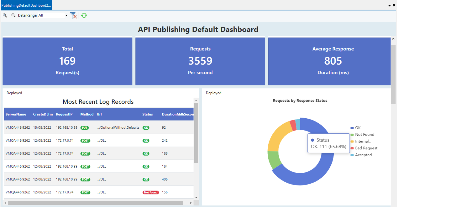 Requests by Response Status - This shows the percentage of each of the different responses for the deployed APIs.