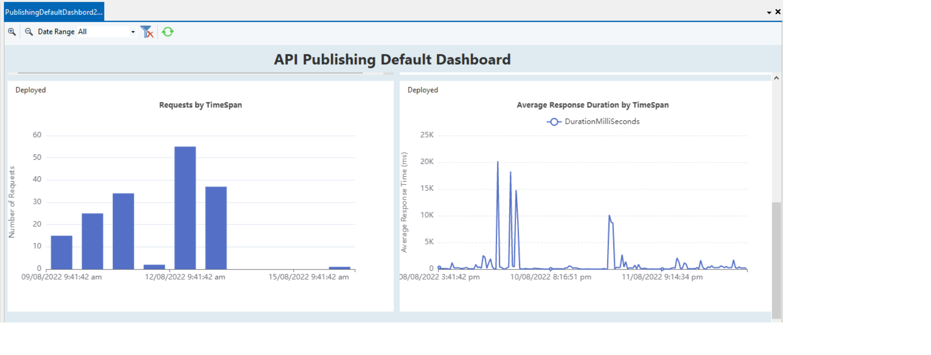 The dashboard shows various performance metrics and graphs which can be used to monitor the deployed APIs. These include,