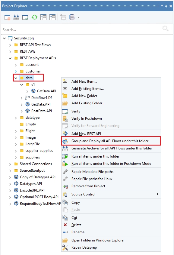 We can group and deploy API flow(s) contained under a folder. All the folder nodes present under the project have the Group and Deploy All API Flows under this Folder option, including the parent .cprj project node. Only the API flows shall be verified and deployed whereas all the other artifacts will not be considered in the deployment process.
