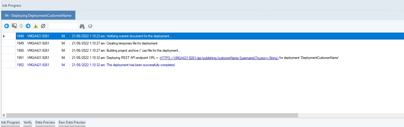 Success or Failure of the deployment will appear in the Job Progress window. In case of any errors, the verification window can be used to identify and fix errors. As the verification was successful, the API endpoints are visible in the trace.