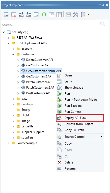 Similarly, the Deploy API Flow option from the Project Explorer context menu can also be used. This option is only available for API flows.