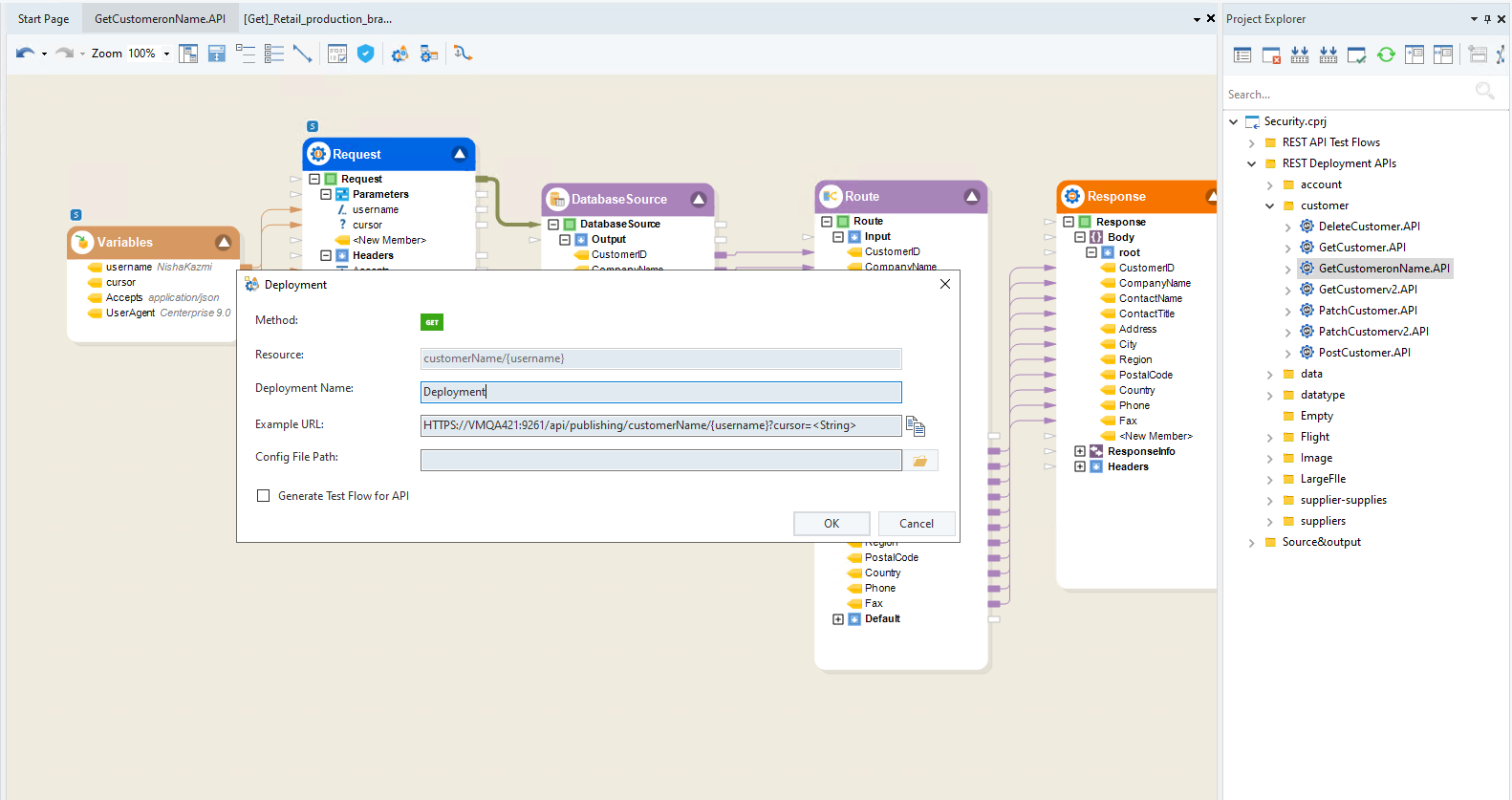 In this example, we have grouped and deployed all API flows under the folder called “Data”. It’s noticeable that the folder, “Data”, has a nested folder, “v1”, under it. In the case of deploying from a folder that contains nested/child folder(s), the name of the nested folder(s) will be appended to the API’s URL as a part of its Resource. For example, ‘’{base URL}/Nested Folder Name/Flow Resource/Parameters’’ such as ‘’https://localhost:9621/v1/{Resource}/{Parameters}.’’