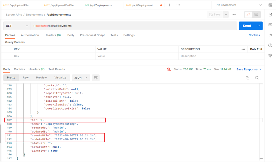 So, to gather the details, we firstly use the ‘*GET api/Deployments’* API to fetch the info of the existing deployment. Then, we copy the deployment *Id*,  *UpdateDtTm*, and *CreatedDtTm* fields from the response.