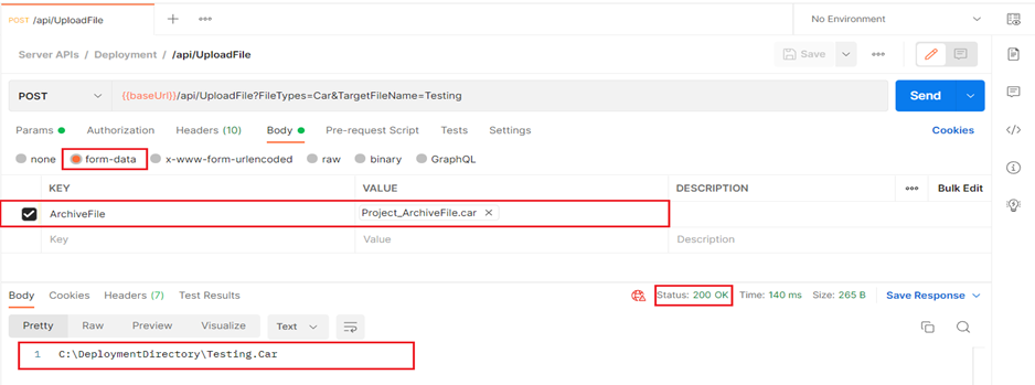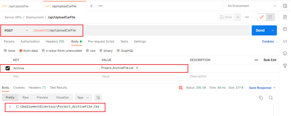 In this API, we do not need to specify the query parameters. Simply select the archive file (.car file) in the body and click Send. Here, we receive the archive file path in the response.
