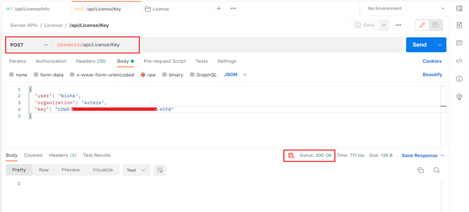 In response, we can see that a 200 OK success status is received indicating that the license key has been changed.