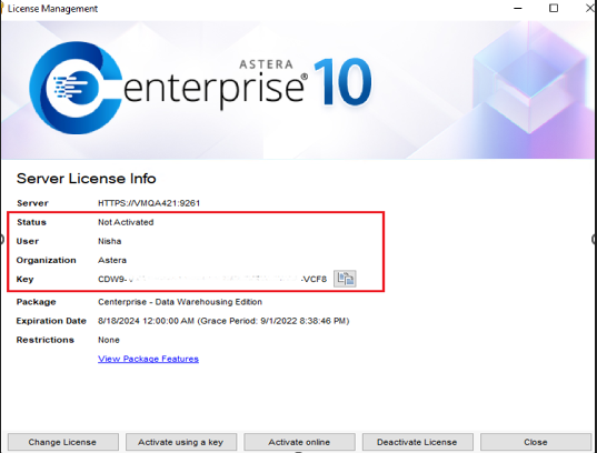 Now, go to *Server > Configure > Enter License Key*, and notice the license properties. We can see a user *Nisha* of the organization *Astera* with a different/new license key has been registered.<br>