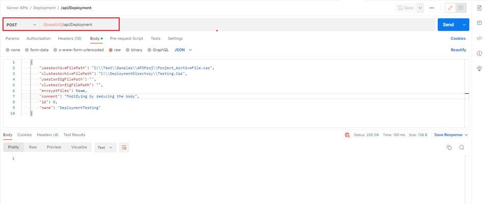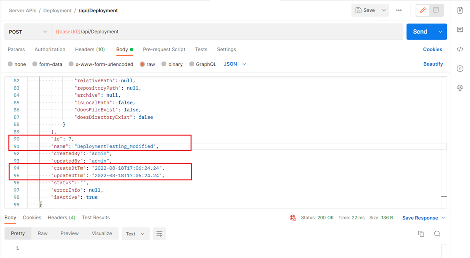 Now, in the POST Request’s Body, let’s change the deployment *Name* to *DeploymentTesting\_Modified* and replace the values of *Id*, *UpdateDtTm*, and *CreatedDtTm* fields with the values copied from the GET response.