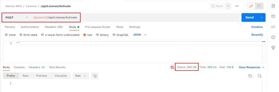 **Note:** To receive a 200 OK response, we must send an empty text in the body otherwise the request will result in an error. Also, this API only activates the license online.