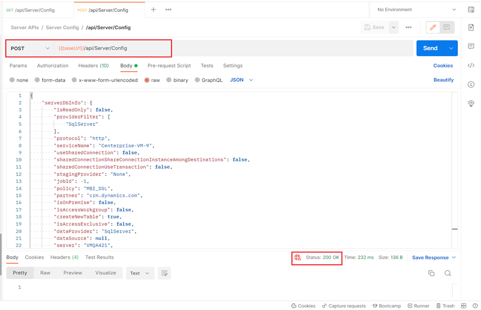 **Note:** To see how the JSON request body is structured or what fields are required for a successful POST request, send a request to the *GET /api/Server/Config* API. This API will return the configured server’s properties in the response.