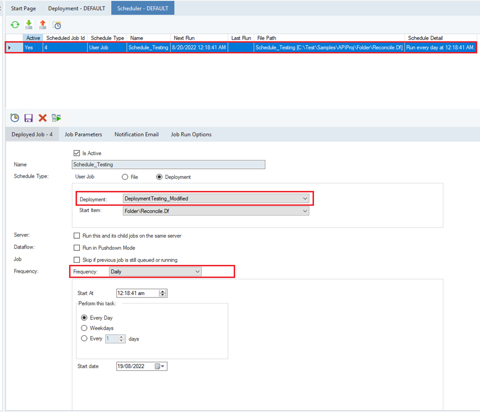 Let’s create the schedule called *Schedule\_Testing,* which runs *daily*, with schedule type *deployment*, an active state as *True,* etc.