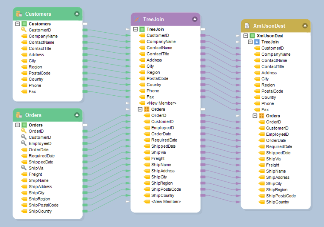*Customers* and *Orders* data from database tables will be used as source objects. We will then join them using the *TreeJoin* Transformation to create a hierarchical dataset.