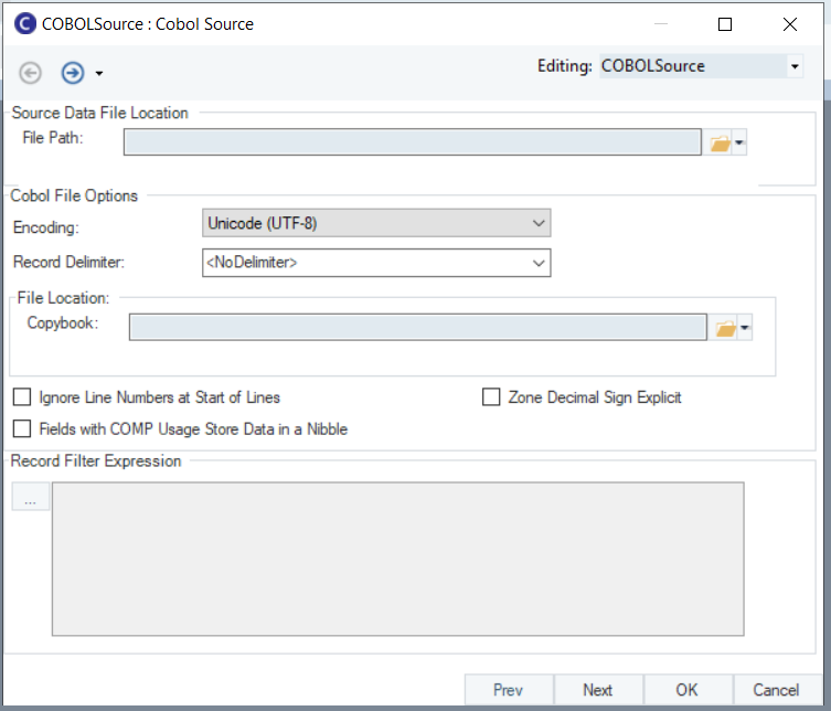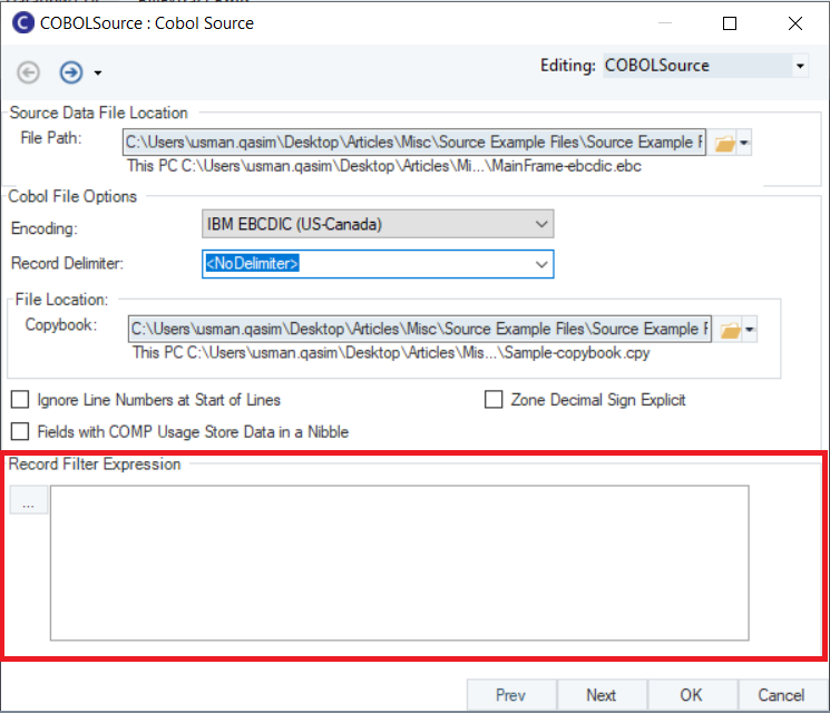 *Record Filter Expression*: Here, we can add a filter expression that we wish to apply to the records in the COBOL File.