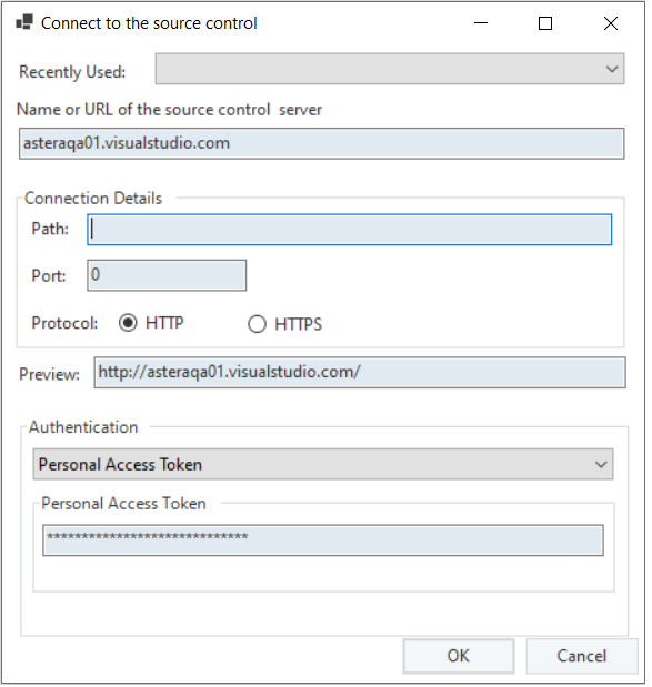 Various authentication methods can be used to connect to Visual Studio Team Services (Visual Studio Online). When using these authentication methods, the *Path* can be set as empty with *Port* set to 0.
