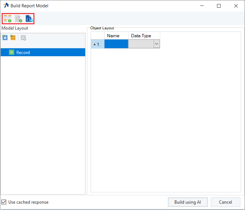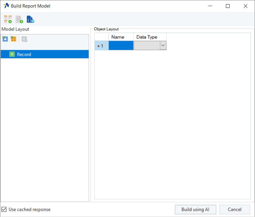 For standalone report model layout creation, open a new report model with the file. Then select the Auto create Layout (AI) option from the toolbar.