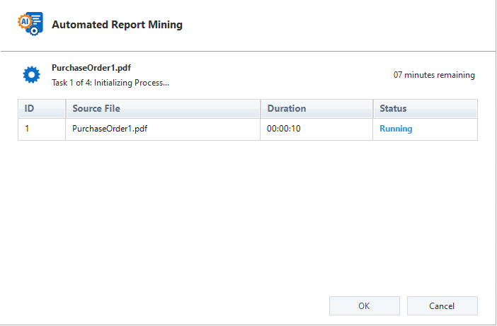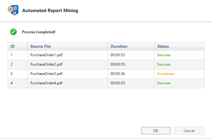 8\. The automated report mining will generate report models for each file in the folder and save successfully generated files to the *AI Generated Report Models folder* that has been created in the project. In case the file does not contain the required fields, the generated templates will be kept in the *Erroneous Report Models folder* that has been created in the project. You can access these report models if you wish to verify and/or edit them.