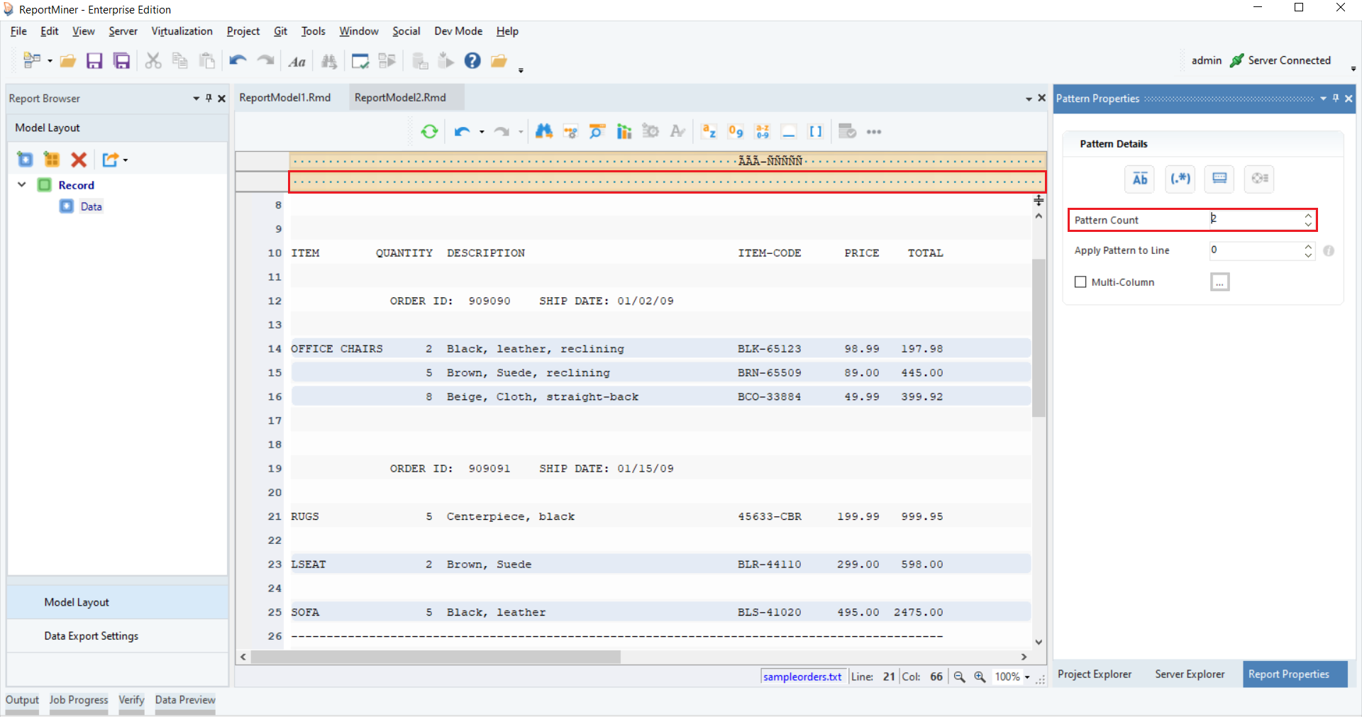 *Pattern Count* is the number of patterns that Astera matches on your file to capture a data region. This is useful if more than one pattern is required to identify the beginning of your data region. You can specify up to five patterns in a report model at a time.