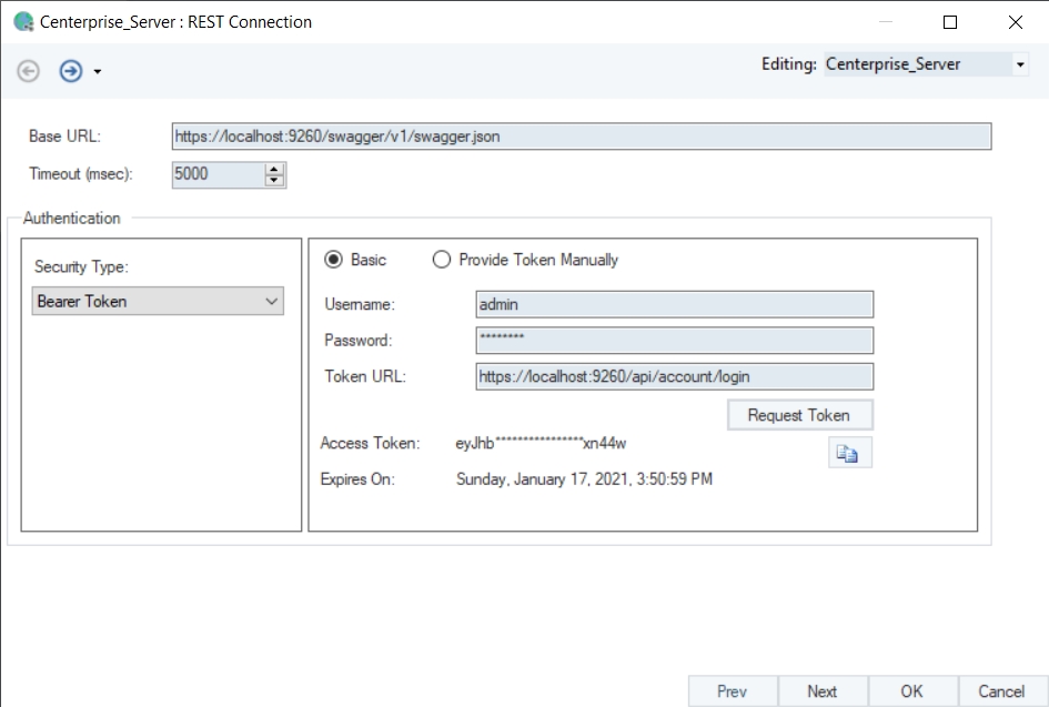 Provide the User Name, Password, and Token URL for Bearer Token. Then click Request Token to generate a token, and click OK. Press Ctrl+S to save changes in the shared action file.