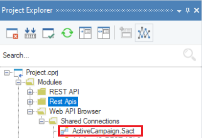 Now, you need to authenticate the ActiveCampaign APIs to use them in your dataflow. Without authentication, you will get an error. To authenticate an API, go to the Project Explorer and double-click on the API’s .sact file under the Shared Connection node.