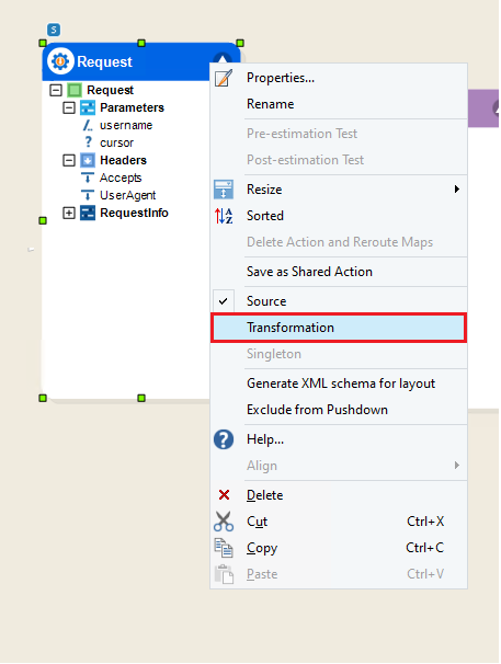 To define test values for the API flow, the Request object must be set as a transformation and any test data can be mapped to it. Right-click on the Request object and select Transformation.