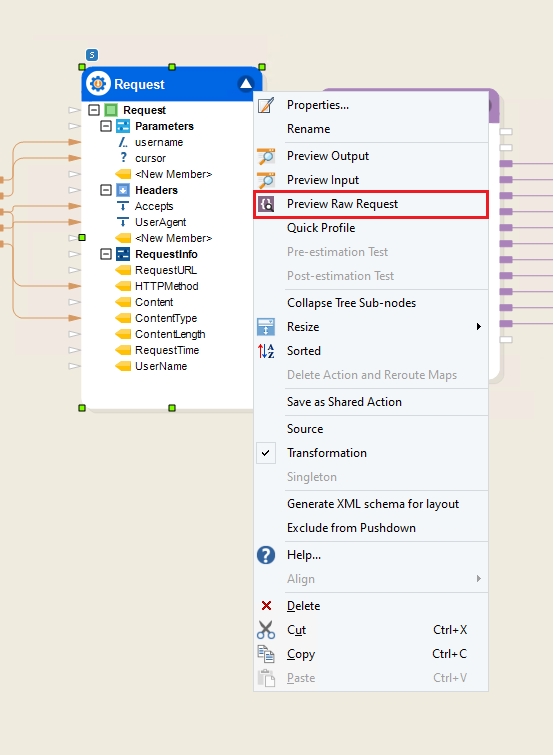 Right-click on the header of the Request Publish object. Select the Preview Raw Request option from the context menu.