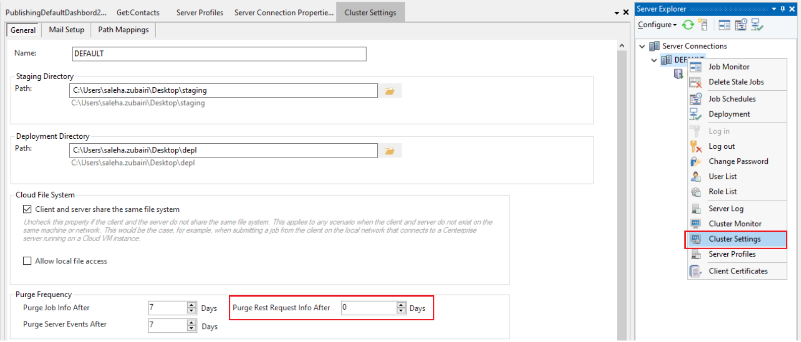 From the Server Explorer, right-click on the cluster node and open Cluster Settings. Here, you can set the Purge REST Request Info After value to enable purging the source table.
