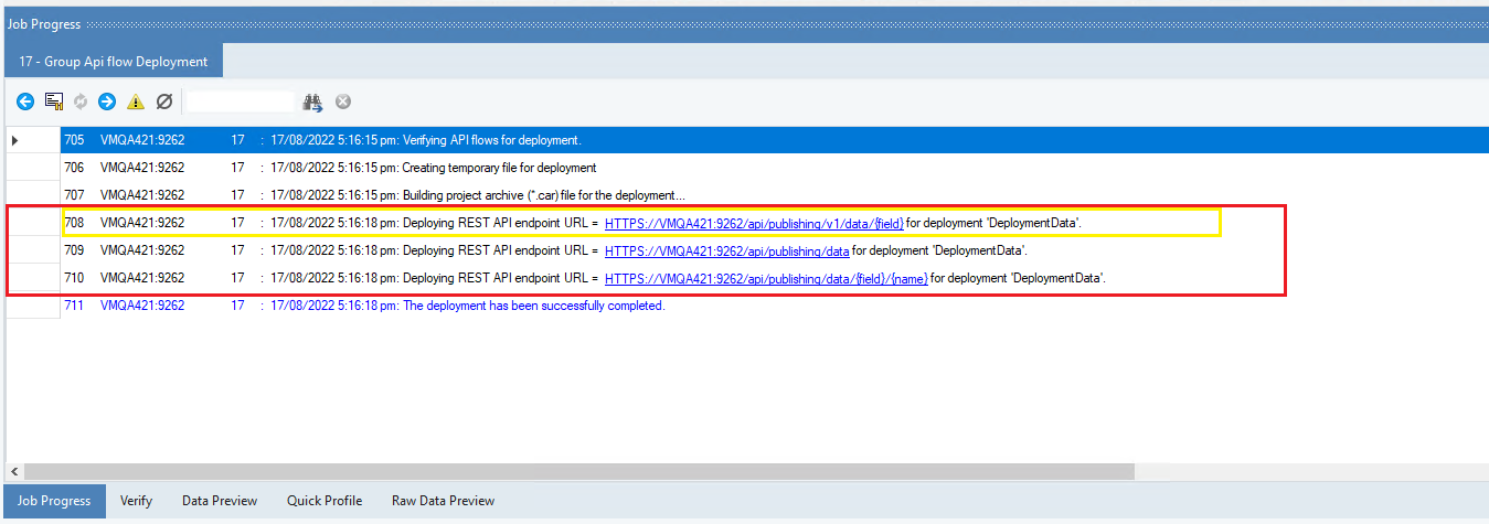Success or Failure of the deployment will appear in the Job Progress window. In case of any errors, the verification window can be used to identify and fix errors. As the verification was successful, the API endpoints are visible in the trace.