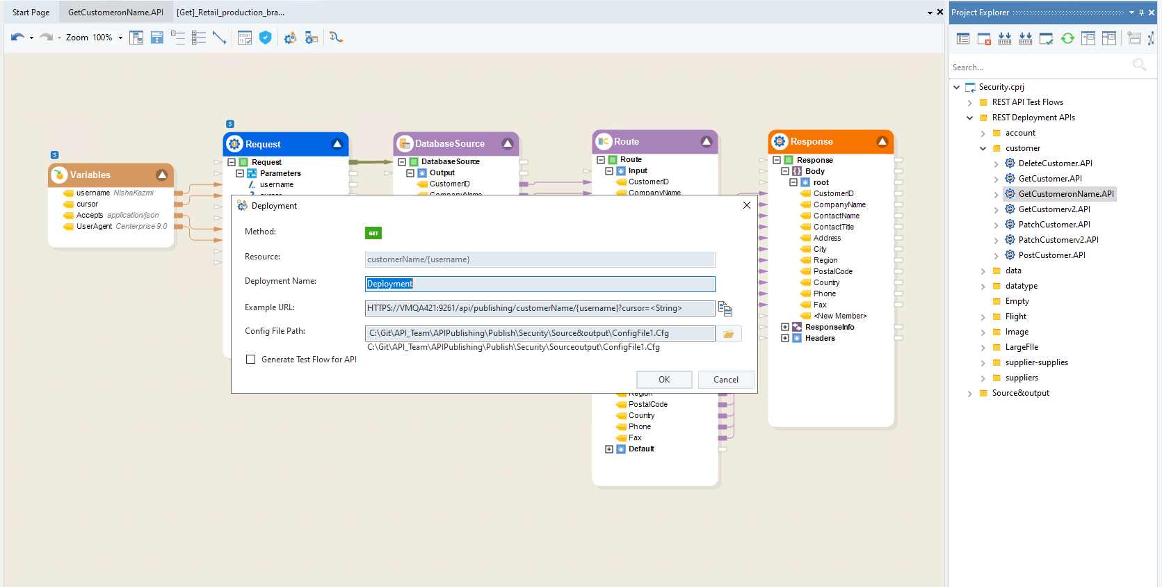 In this example, we have grouped and deployed all API flows under the folder called “Data”. It’s noticeable that the folder, “Data”, has a nested folder, “v1”, under it. In the case of deploying from a folder that contains nested/child folder(s), the name of the nested folder(s) will be appended to the API’s URL as a part of its Resource. For example, ‘’{base URL}/Nested Folder Name/Flow Resource/Parameters’’ such as ‘’https://localhost:9621/v1/{Resource}/{Parameters}.’’
