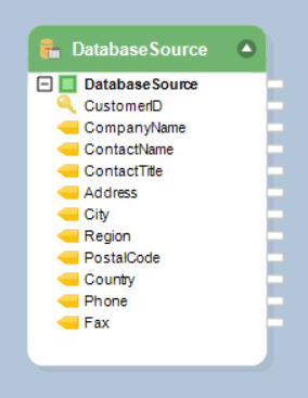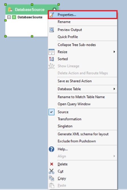 To configure the Database Table Source object, right-click on its header and select Properties from the context menu.
