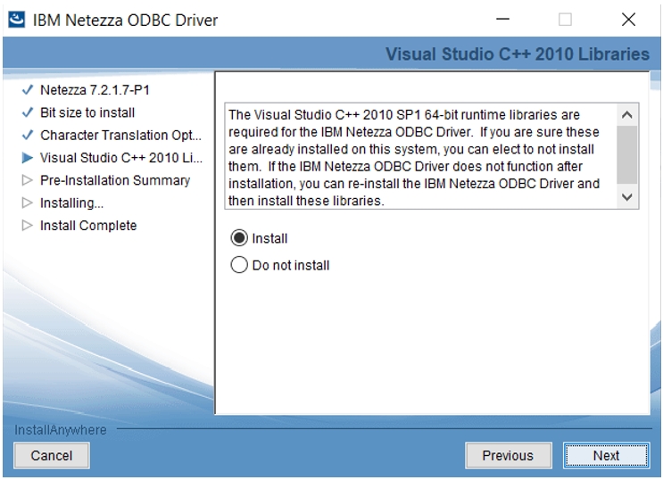 The next screen will provide the option to install C++ libraries. Select Install and click Next.