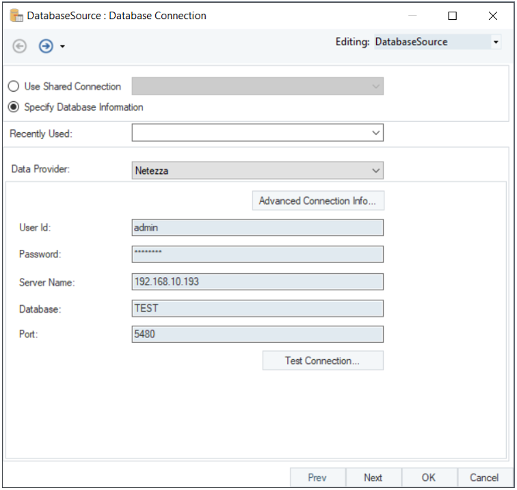 On the Database Connection window, select Netezza in the Data Provider drop-down list.