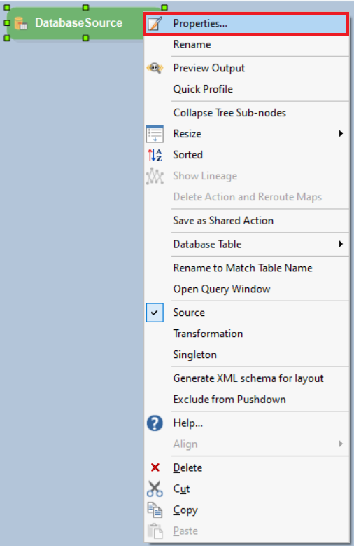 To configure the properties of a Database source, right-click on the object’s header and select Properties.