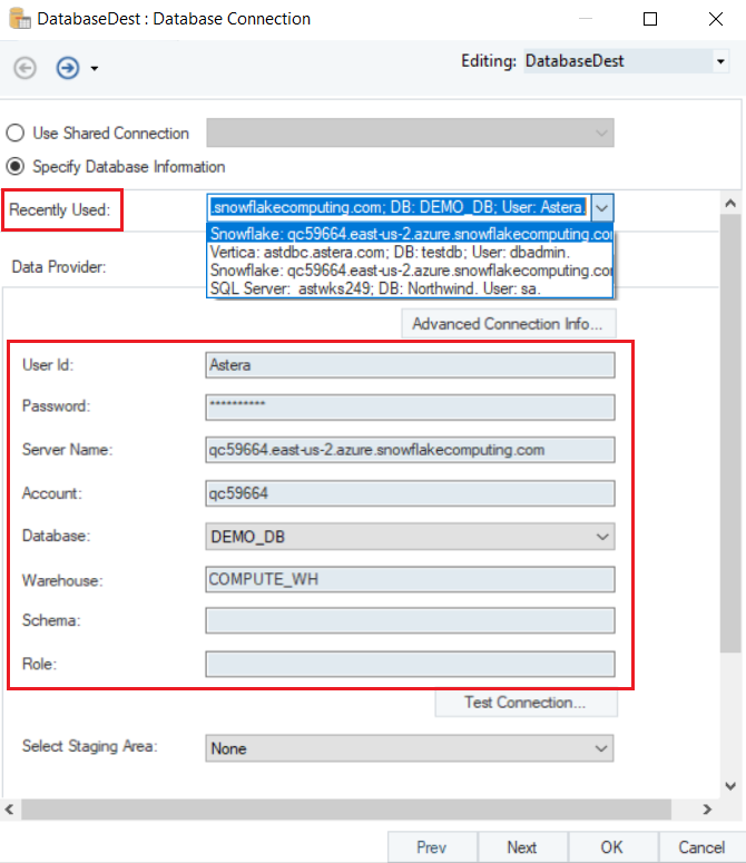Since we have previously used Snowflake database to extract our source data, we can use the Recently Used credentials to connect to it again.
