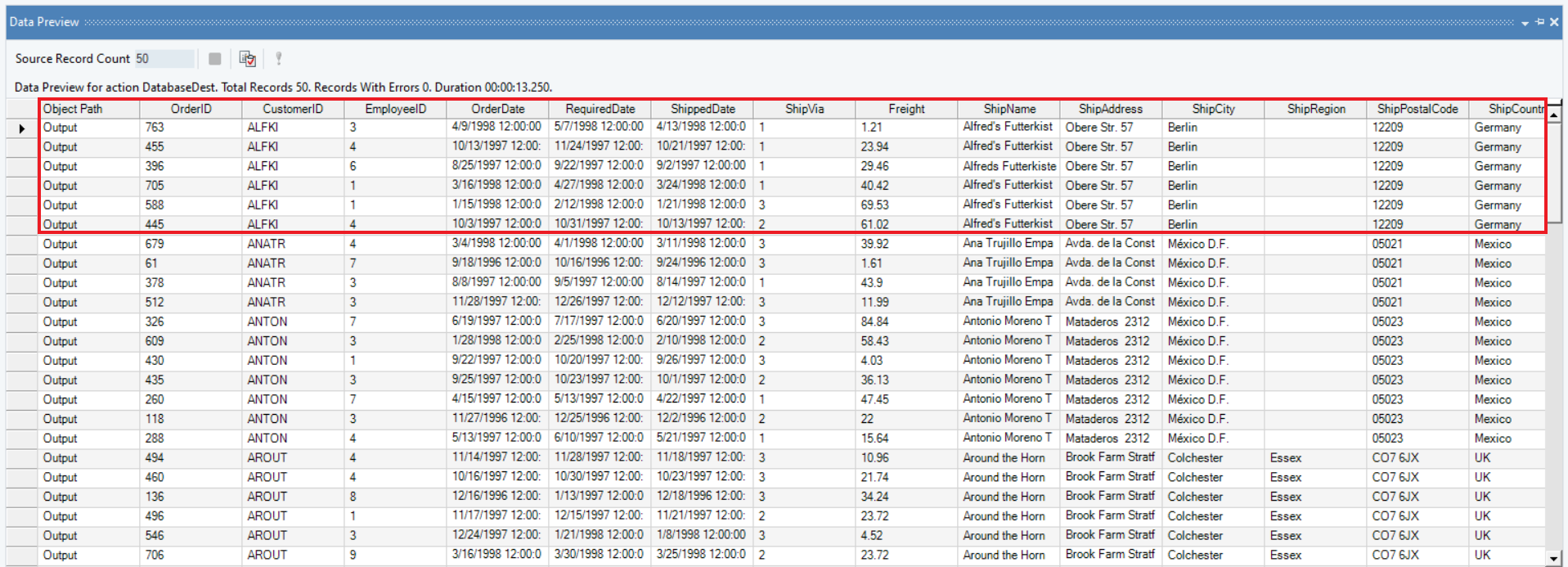 Now, if we preview the data in the database table, we can see that the details for all the orders placed by customers have been written into the destination table.