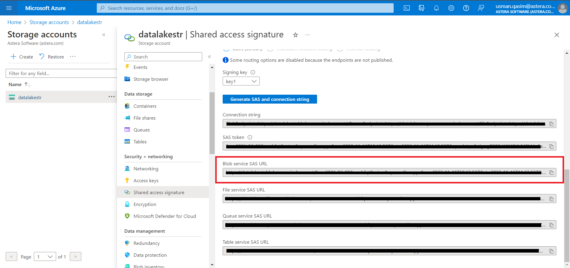 To connect to Azure Data Lake Gen 2 and Azure Blob Storage Account in Astera, you need to have the access token or SAS keys. Follow the steps below to obtain authentication specifications from your Microsoft Azure account.