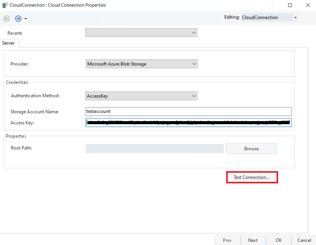 Click OK and the Cloud Storage Connection object will be configured.