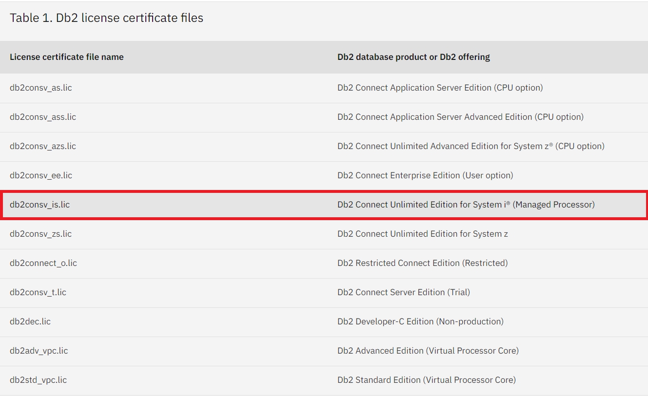Scroll down to Table 1. DB2 License Certificate Files and select the license certificate file named db2consv_is.lic.